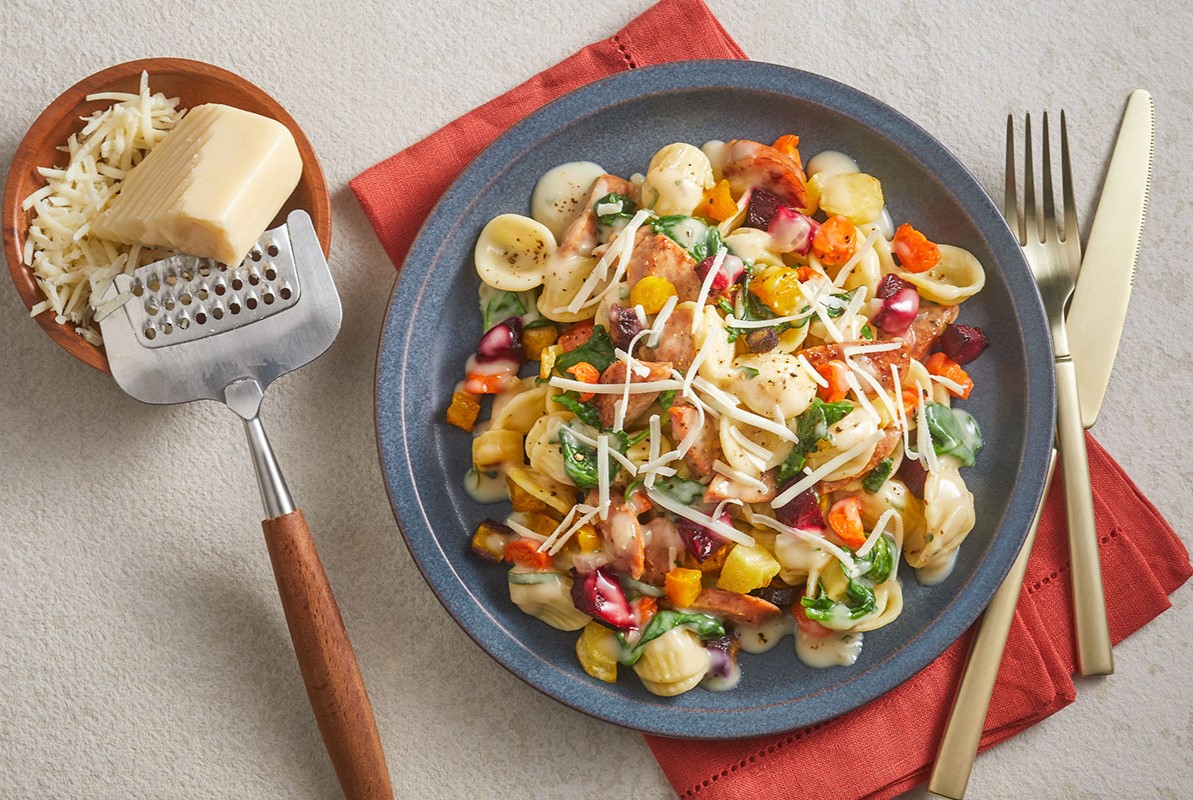 This Cheddar Gruyere and Sausage Pasta Toss brings together the earthy sweetness of roasted root vegetables, the smoky depth of Applewood Smoked Sea Salt Cheddar Gruyere, and the vibrant flavors of fresh herbs. Paired with tender orecchiette pasta and juicy chicken sausage, each bite is a comforting symphony of flavor and texture.
