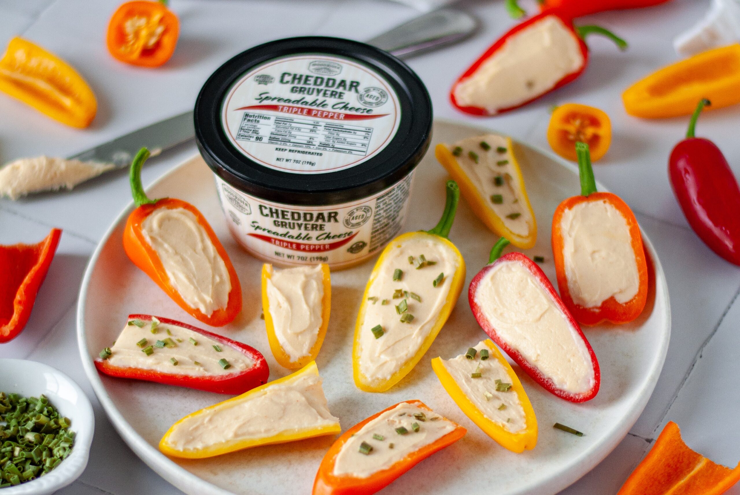 Use a spoon to fill each pepper up with Wood River Creamery Cheddar Gruyere Triple Pepper Cheese Spread (or the cheese mixture if using cream cheese)