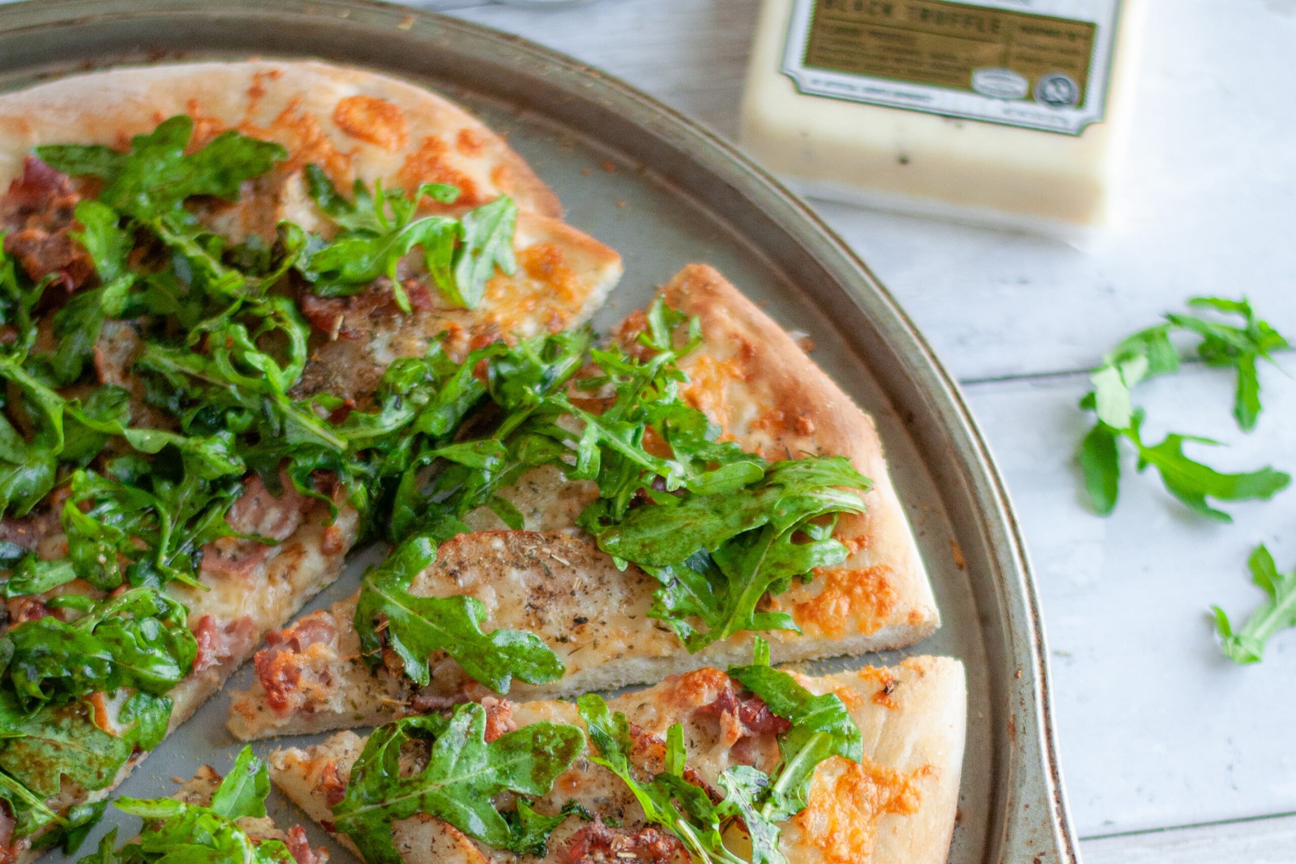 Looking for a way to make pizza night extra special? Try our Truffled Prosciutto & Pear Pizza recipe featuring Wood River Creamery Black Truffle Cheddar Gruyere cheese! The rich, earthy truffle flavor blends perfectly with sweet pears, savory prosciutto, and fresh arugula to create a gourmet masterpiece at home.